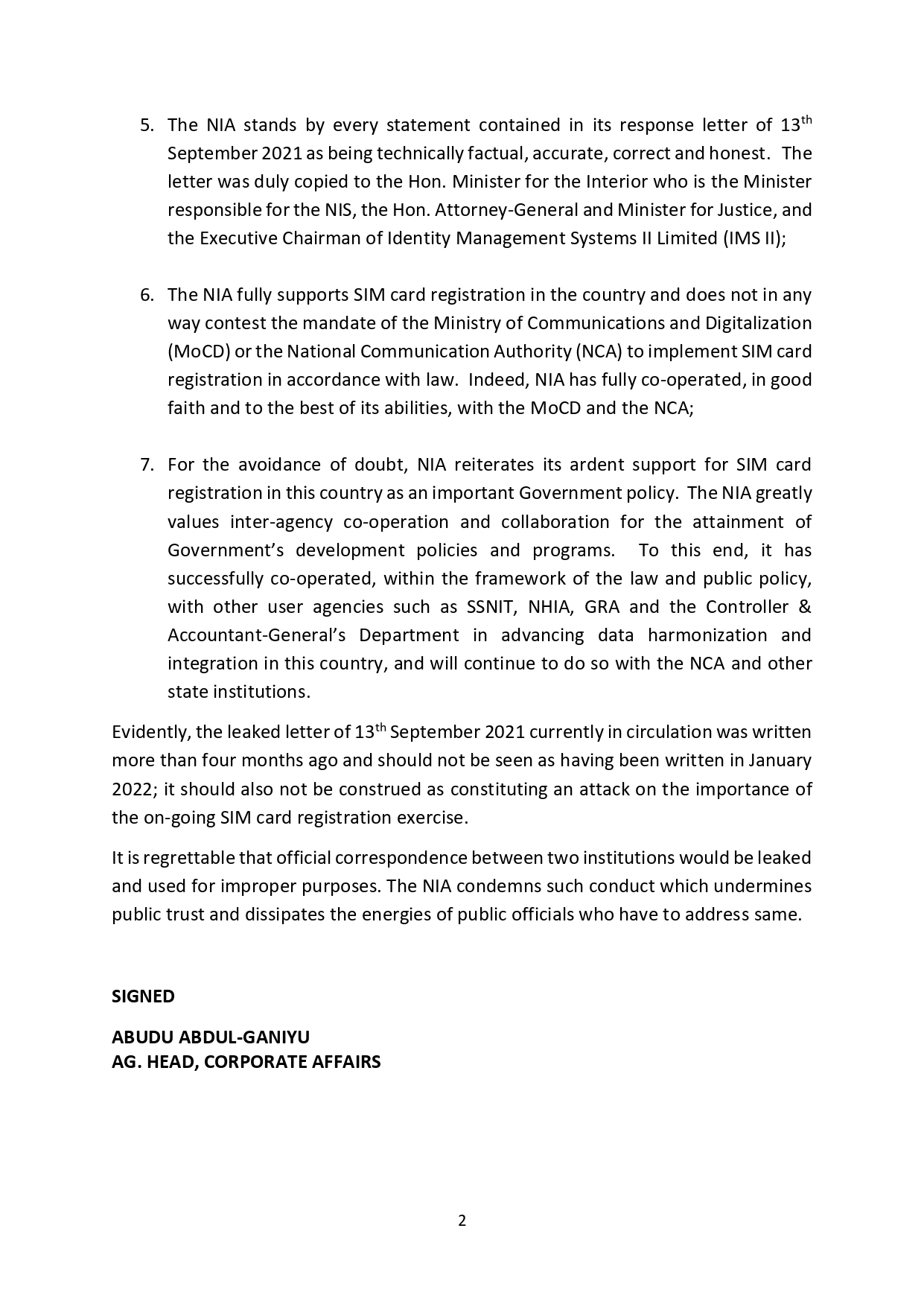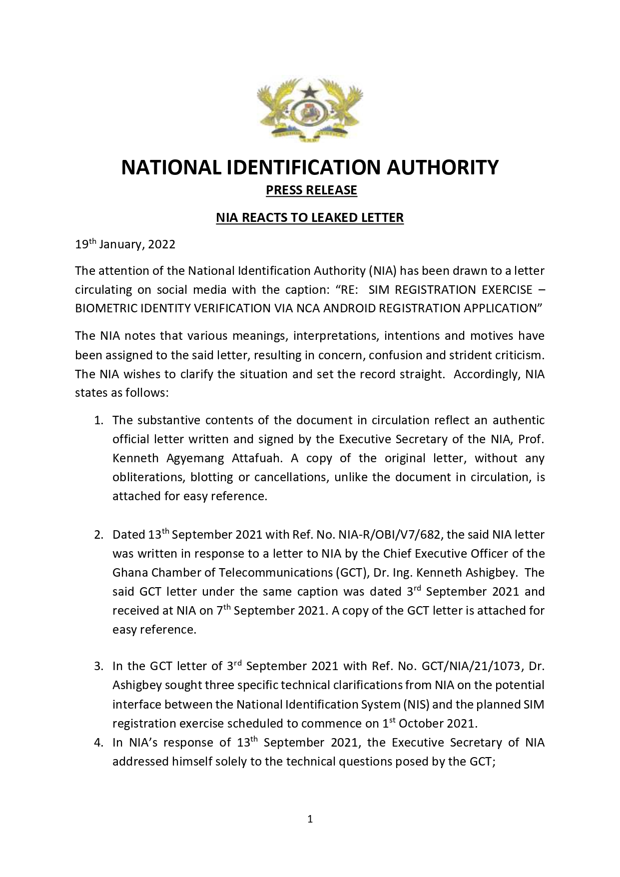 A press statement dated Wednesday, January 19, 2022 and issued by the NIA said a leaked letter on the issue in circulation was indeed from the NIA but had been twisted to create the impression that the NIA was not in support of the SIM card registration.