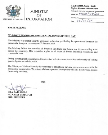 No private drones will be allowed at the Black Star Square and its environs during the presidential inauguration on Tuesday, January 7, 2025, the Ministry of National Security has announced.