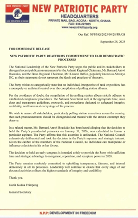 Secondly, the release directly countered an allegation from Mr. Boasiako that the scheduled date for the presidential primaries was biased. "Mr. Bernard Antwi Boasiako has been heard alleging that the decision to hold the Party’s presidential primaries on January 31, 2026, was calculated to favour a particular aspirant. The Party affirms that this assertion is unfounded."