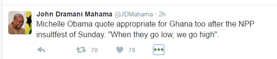 The President in response to the NPP’s attacks tweeted on Monday morning that “Michelle Obama quote appropriate for Ghana too after the NPP insultfest of Sunday. When they go low, we go high".