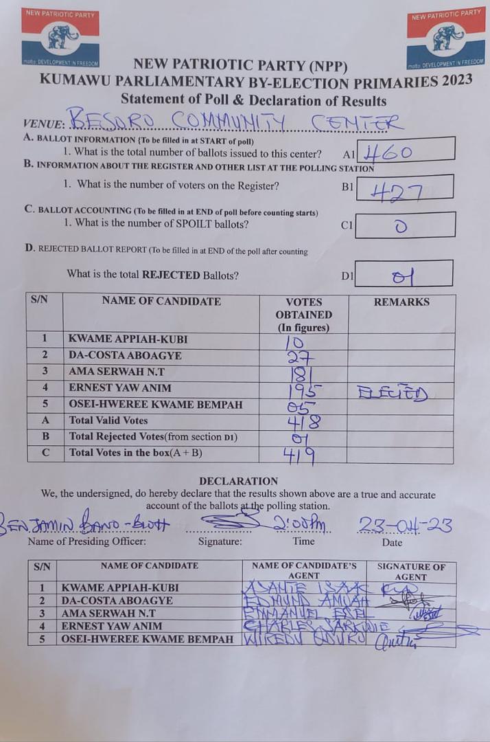 Ernest Yaw Anim on Sunday afternoon emerged the Parliamentary candidate for the New Patriotic Party in upcoming by-election in the Kumawu Constituency.
