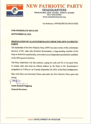 Alan Kyerematen announced his resignation from the NPP on Monday afternoon, [Sept 25, 2023] and said he was leaving the party due "unfair treatment towards him and his supporters by the party’s hierarchy."