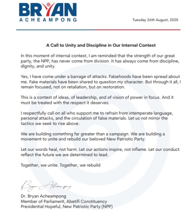 In a public statement titled "A Call to Unity and Discipline in Our Internal Contest," the Member of Parliament for Abetifi constituency in the Eastern Region acknowledged he has faced a "barrage of attacks" designed to question his character.