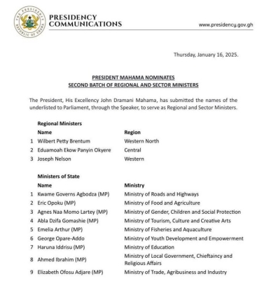 Other nominees by President Mahama include Kwame Governs Agbodza for the Ministry of Roads and Highways, and Agnes Naa Momo Lartey for the Ministry of Gender, Children, and Social Protection.