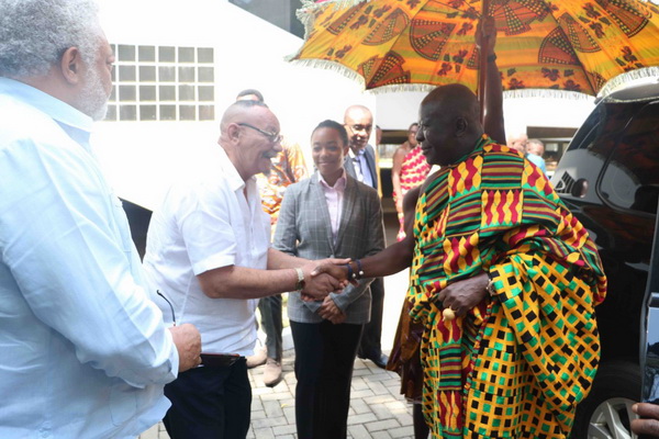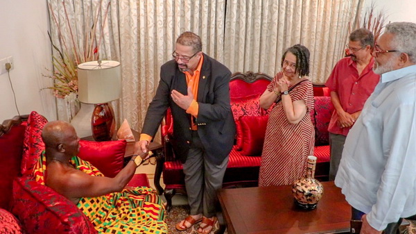 Accompanied by a retinue of chiefs and elders from the Manhyia Palace, Otumfuo Osei Tutu exchanged pleasantries with the former President, his family, staff and some visiting African American school colleagues after which the two proceeded to hold private discussions.