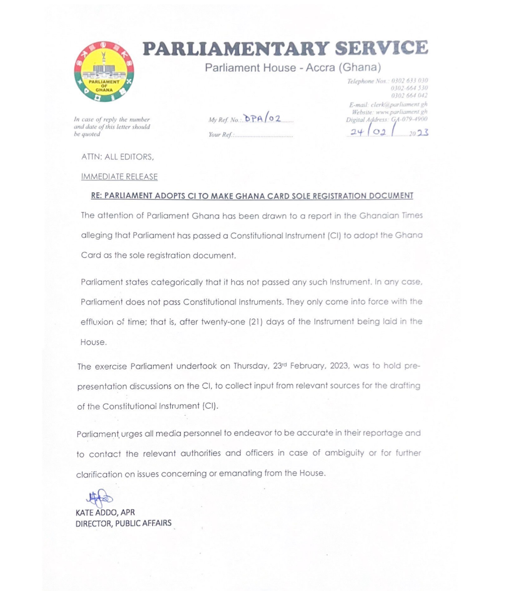 The Director of Public Affairs at Parliament, Kate Addo has reacted to a media publication that suggested that Parliament has passed the Constitutional Instrument (C.I.) seeking to make the Ghana Card the sole registration document for new voters.