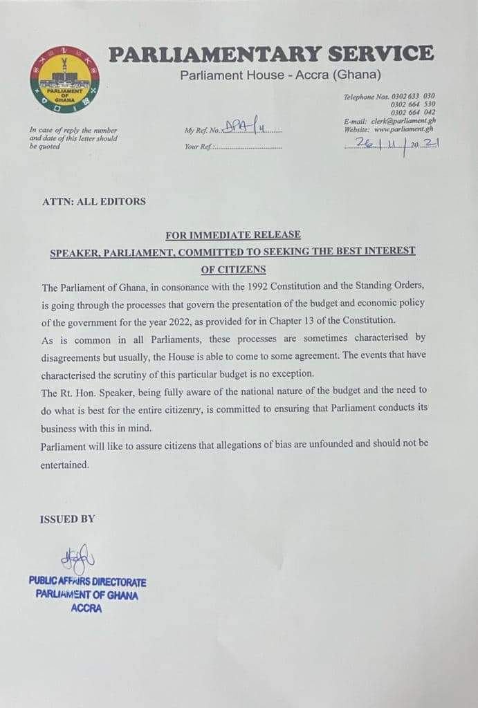 Meanwhile, the Public Affairs Directorate of Parliament has issued a press statement on the development in the House on Friday.