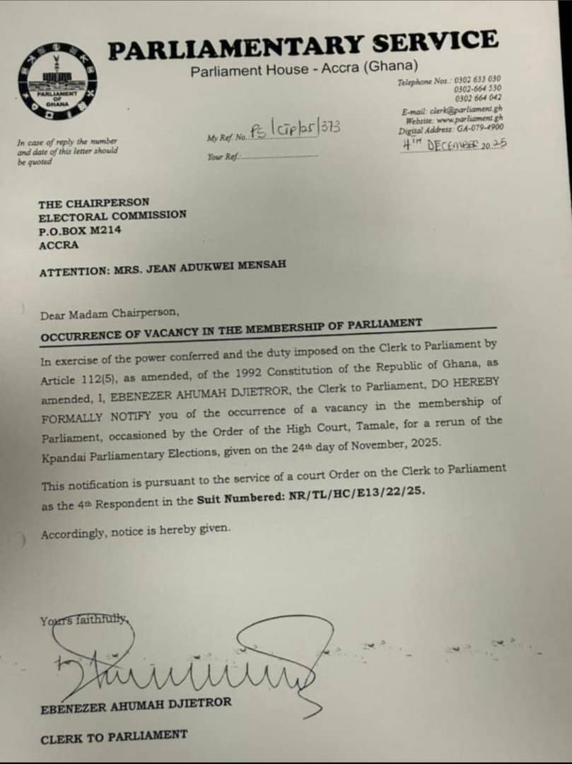 The Parliamentary Service has formally notified the Electoral Commission (EC) of a vacancy in the membership of Parliament for the Kpandai Constituency, following a court order mandating a re-run of the 2024 parliamentary election in that area.
