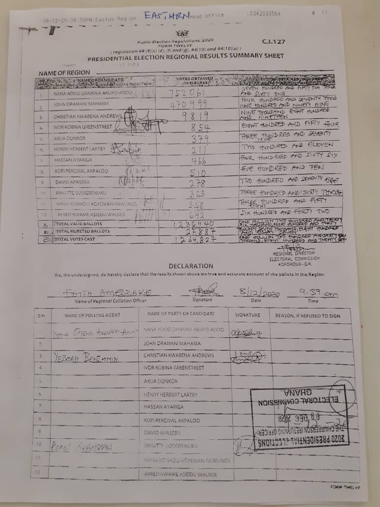 The Electoral Commission has published certified copies of the 2020 Presidential Election Regional Results Summary Sheets.