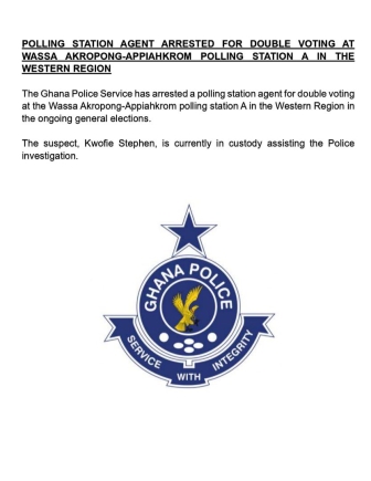 The Ghana Police Service has arrested a polling station agent for attempting double voting at the Wassa Akropong-Appiahkrom Polling Station A in the Western Region during the ongoing general election on December 7.