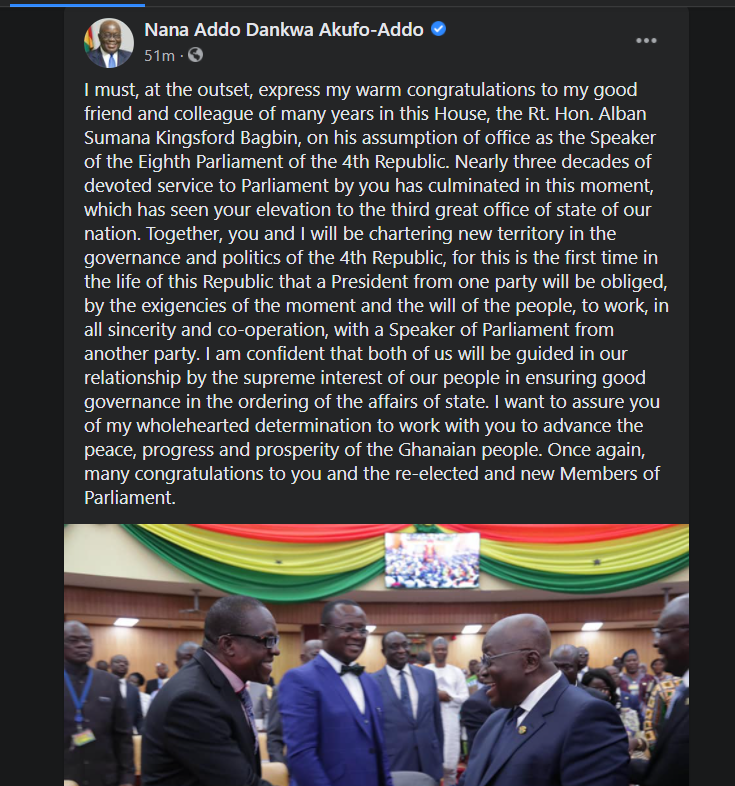 President Akufo-Addo in a Facebook post on Thursday, January 7, 2021, praised Mr Bagbin for his dedicated service to the cause of Ghana.