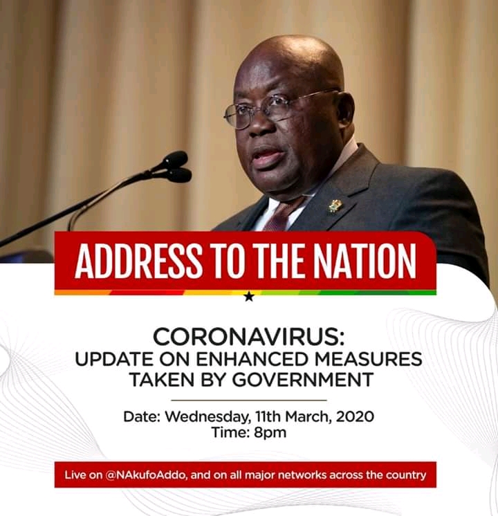 Delivering an address to the nation on Wednesday, 11thMarch, 2020, the President explained that, with the declaration by the World Health Organisation (WHO) of the Coronavirus disease as “a pandemic”, it is important that Ghana steps up her preparedness to ensure that, beyond the initial measures that have been put in place, a ‘whole of Ghana’ approach is adopted in preparation for a possible hit within the country’sborders.