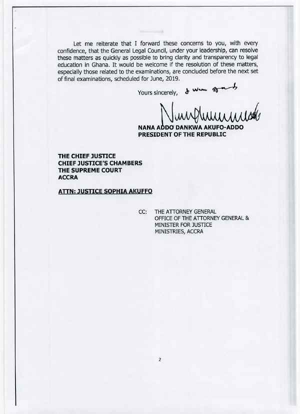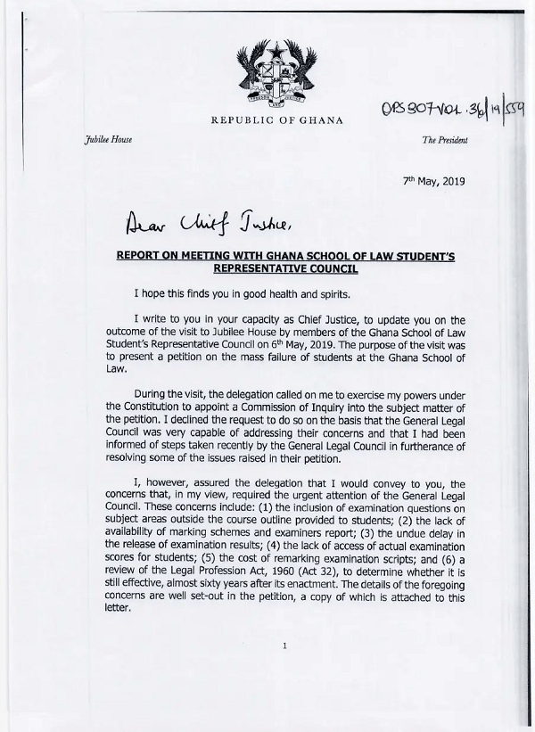 The letter, dated May 7, 2019, pointed out six issues which in President Akufo-Addo's view, required the General Legal Council’s urgent attention.