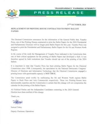 In a press statement dated Sunday, October 27, 2024, signed and issued by Samuel Tettey, EC Deputy Chairman in charge of Operations, the EC explained that Buck Press and Acts Commercials "have demonstrable expertise and the Commission is certain that this change will not compromise the calendar for the printing of the Ballot Papers."