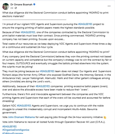 Because of their #EAGLEEYES, one of the companies contracted by the Electoral Commission to print ballot materials must lose their contract. Since printing commenced, YASARKO printing company has not been printing. Excuses upon excuses...
