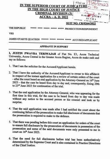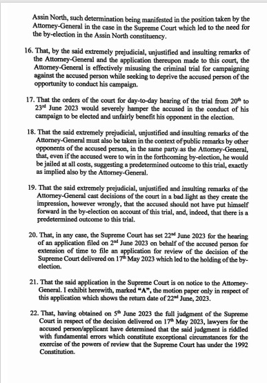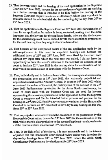 26. That, individually and in their combined effect, theincomplete disclosuresby the prosecution even as at 1 5 June 2023, the extremely prejudicial and unjustified remarks of the Attorney-General in court on 16th June 2023 which occasioned the orders of the court, the participation of the accused in the 27t June 2023 Parliamentary by-election for the Assin North constituency, the clash of court dates with the Supreme Court and the need for lawyers representing the accused/applicant also in the application before the Supreme Court to complete and file the intended further process and prepare for the hearing on 22nd June 2023 justify a review and/or variation by this Honourable Court ofi t sdecision on 1 6 June 2023 to have day to day hearings in this trial from 20th to 23rd June 2023.