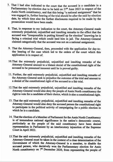 7. That I had also indicated to the court that the accused is a candidate in a Parliamentary by-election due to be held on 27th June 2023 in respect of the Assin North constituency, and that this being "a national assignment" that he was engaged in, further hearing of the trial should be after the said by-election date, by which time also the further disclosures required to be made by the prosecution would have been made.