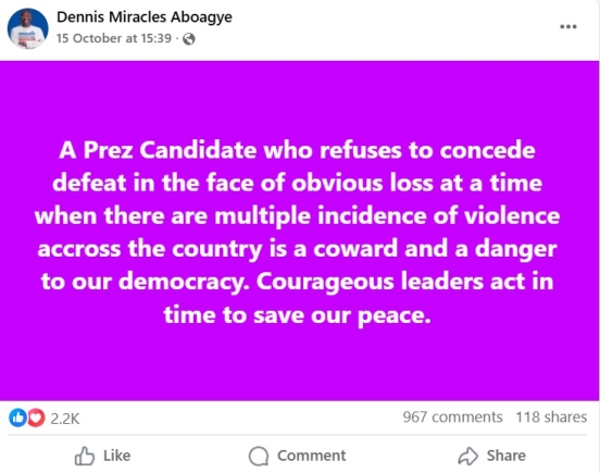 The spokesperson for former Vice President Dr. Mahamudu Bawumia, Dennis Miracles Aboagye, has warned that any presidential candidate who refuses to concede defeat despite an obvious loss poses a threat to Ghana’s democracy.