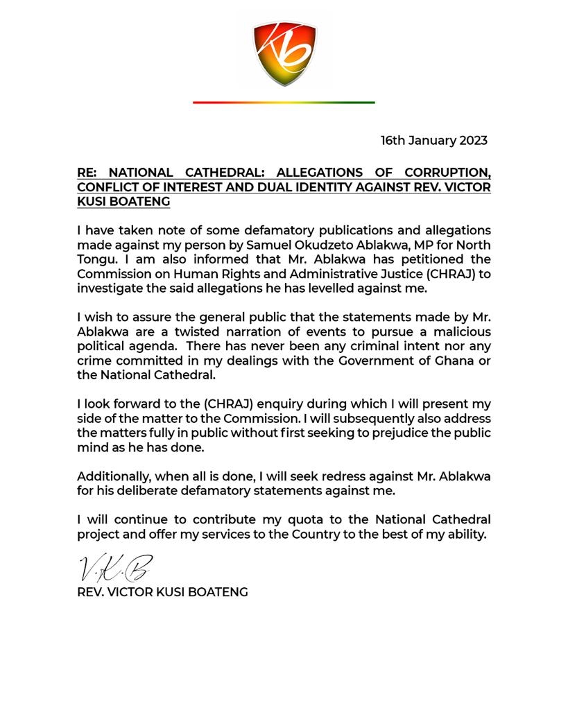 In his petition, Mr Ablakwa accused Rev. Kusi-Boateng of receiving GH¢2.6 million from the National Cathedral Board, alleging that he was the same person as Kwabena Adu Gyamfi.