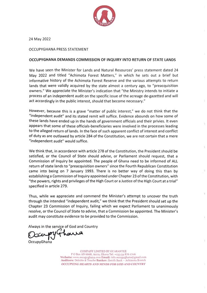 "However, because this is a grave matter of public interest, we do not think that the independent audit and its stated remit will suffice. Evidence abounds on how some of these lands have ended up in the hands of government officials and their privies," OccupyGhana stated.