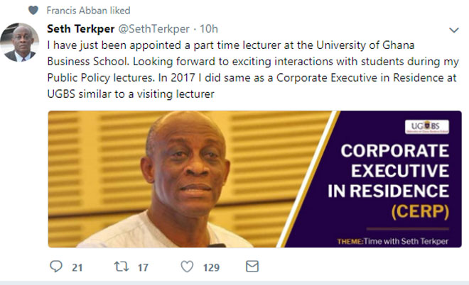 "I have just been appointed a part-time lecturer at the University of Ghana Business School," he tweeted.