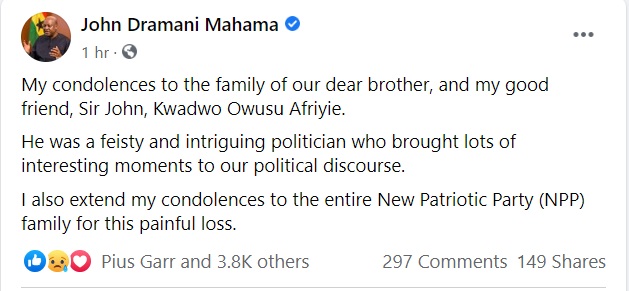 Mr Mahama has therefore expressed his condolences to Sir John's family, saying “My condolences to the family of our dear brother, and my good friend, Sir John, Kwadwo Owusu Afriyie.”