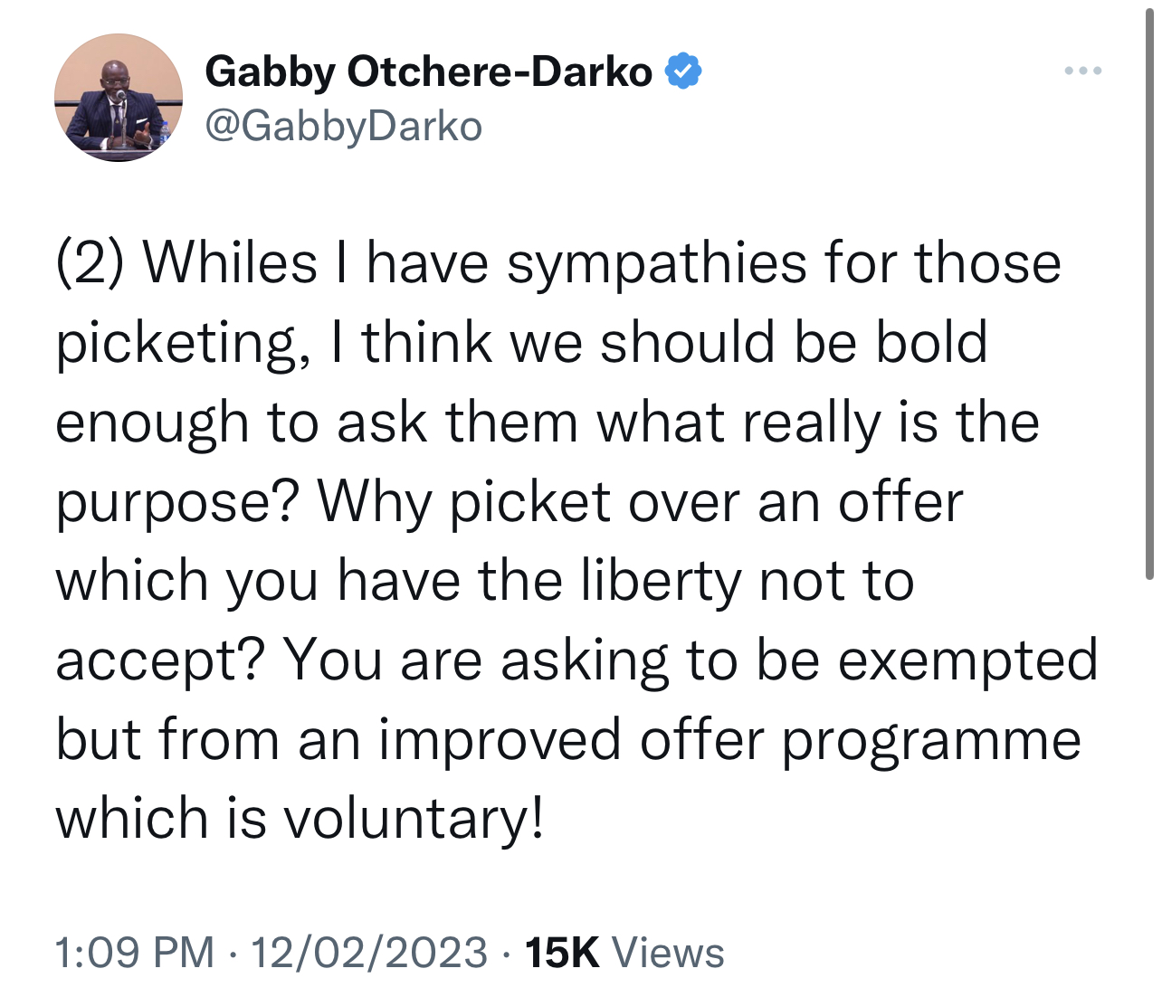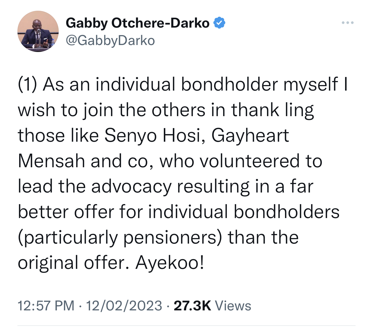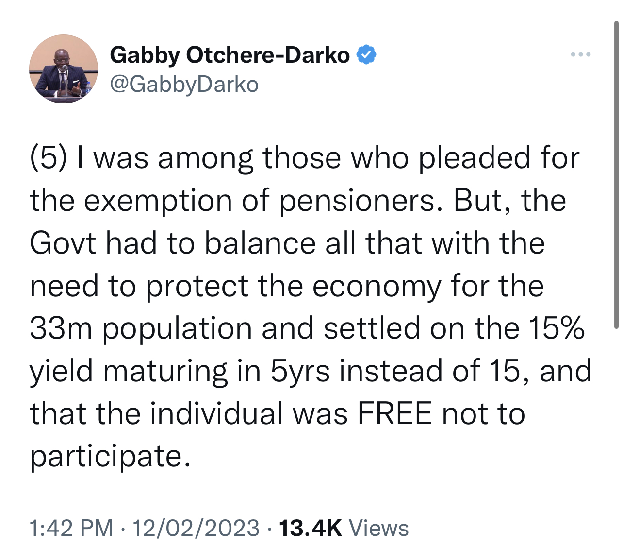 In a series of tweets on Sunday (Feb 12, 2023) afternoon, Mr Otchere-Darko wrote: “I was among those who pleaded for the exemption of pensioners. But, the Govt had to balance all that with the need to protect the economy for the 33m population and settled on the 15% yield maturing in 5yrs instead of 15, and that the individual was FREE not to participate.”