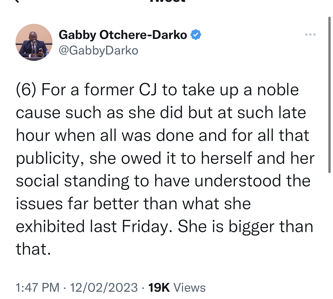 “For a former CJ to take up a noble cause such as she did but at such late hour when all was done and for all that publicity, she owed it to herself and her social standing to have understood the issues far better than what she exhibited last Friday. She is bigger than that.”