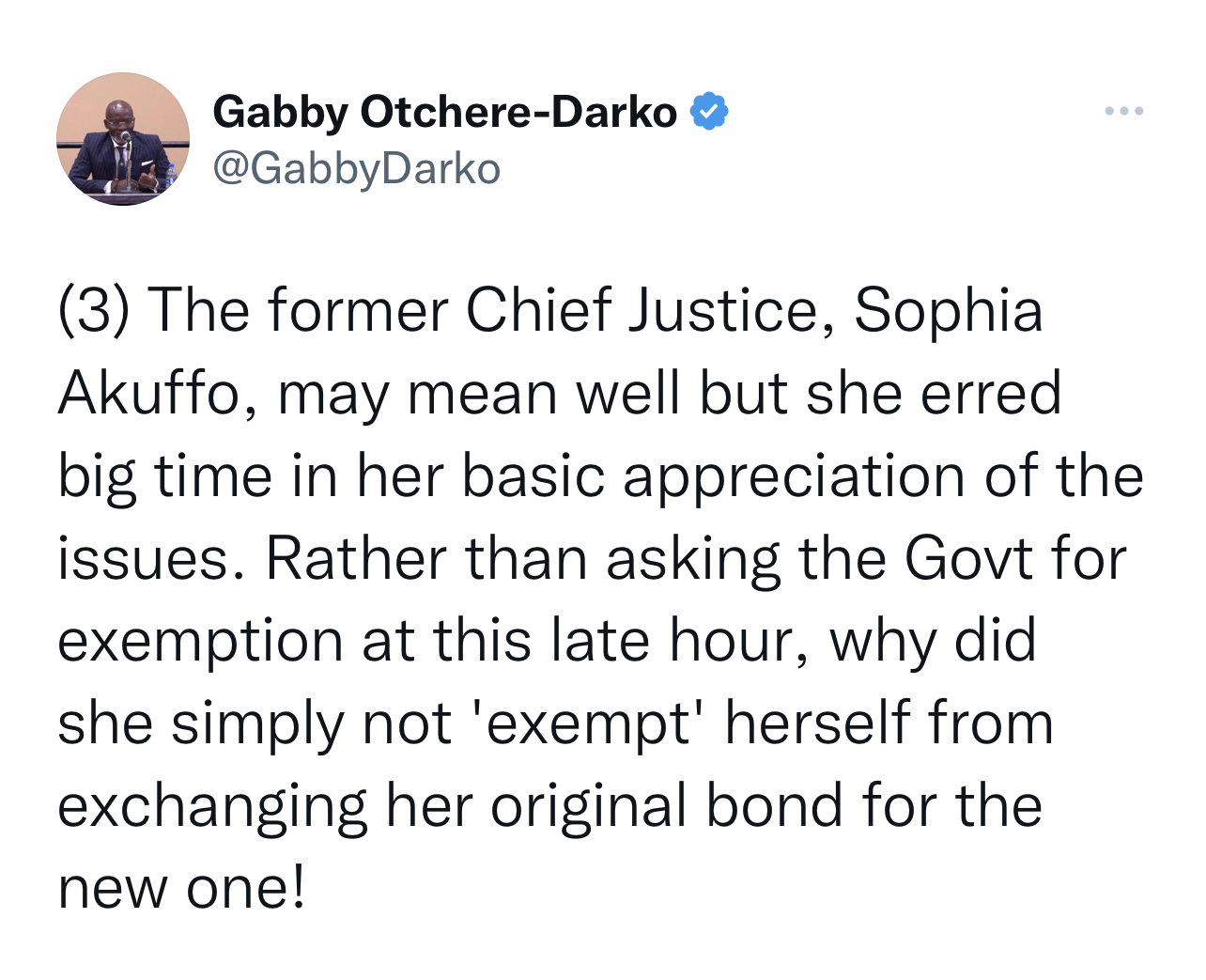 “The former Chief Justice, Sophia Akuffo, may mean well but she erred big time in her basic appreciation of the issues. Rather than asking the Govt for exemption at this late hour, why did she simply not 'exempt' herself from exchanging her original bond for the new one!” he added.