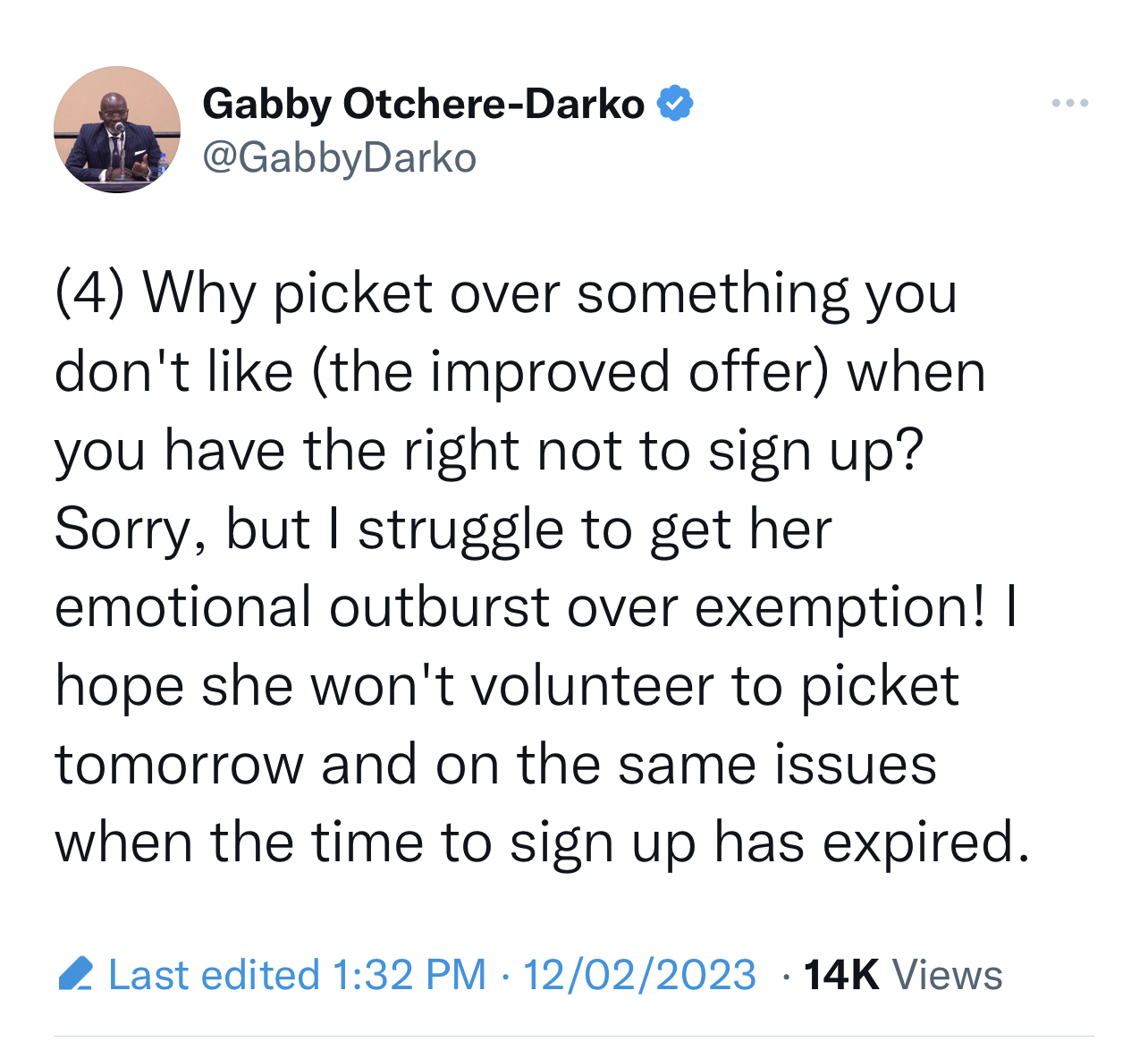 According to Gabby, the offer to self-exempt has been given to pensioners, therefore, there is no need to picket when they could just self-exempt.