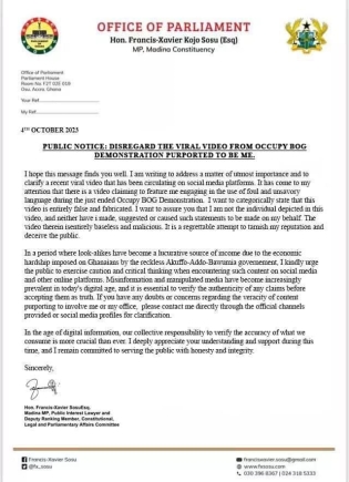 I hope this message finds you well. I am writing to address a matter of utmost importance and to clarify a recent viral video that has been circulating on social media platforms. It has come to my attention that there is a video claiming to feature me engaging in the use of foul and unsavory language during the just ended Occupy BOG Demonstration. I want to categorically state that this video is entirely false and fabricated. I want to assure you that I am not the individual depicted in this video, and neither have I made, suggested or caused such statements to be made on my behalf. The video therein is entirely baseless and malicious. It is a regrettable attempt to tarnish my reputation and deceive the public.
