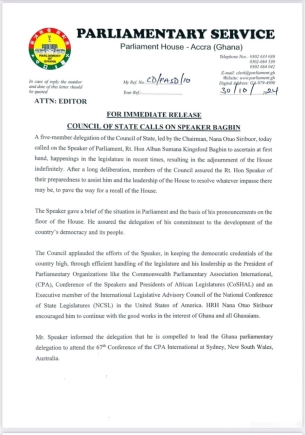 He made this known when a five-member delegation from the Council of State, led by its Chairman, Nana Otuo Siriboe II called on the Speaker on Wednesday [Oct 30].
