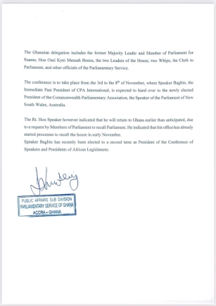 Mr. Speaker informed the delegation that he is compelled to lead the Ghana parliamentary delegation to attend the 67 Conference of the CPA International at Sydney, New South Wales, Australia.