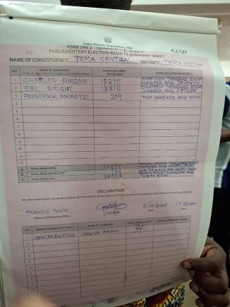 Mr Twum declared, "In view of the above results and by the power vested in me, I declare Mr. Charles Forson MP-elect for Tema Central."