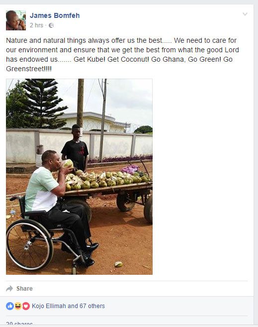 Supporting his flag bearer’s post, the CPP’s James Kwabena Bomfeh responded with a post on Facebook: “Nature and natural things always offer us the best..... We need to care for our environment and ensure that we get the best from what the Good Lord has endowed us....... Get Kube! Get Coconut! Go Ghana, Go Green! Go Greenstreet!!!!”