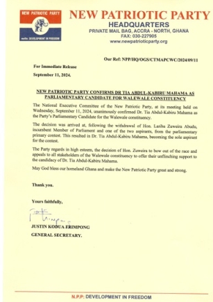 In a press statement dated September 11, 2024, the General Secretary of the NPP, Justin Kodua Frimpong said the National Executive Committee of the NPP at a meeting on Wednesday has "unanimously confirmed Dr Tia Abdul-Kabiru Mahama as the party’s parliamentary candidate for the Walewale constituency."