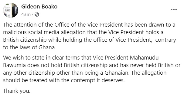 "We have taken notice of a baseless accusation circulating on social media, claiming that the Vice President holds British citizenship while occupying the position of Vice President, which is contrary to the laws of Ghana," the statement on his page read.