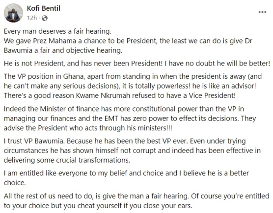 "Every man deserves a fair hearing," Bentil asserted. "We gave Prez Mahama a chance to be President, the least we can do is give Dr Bawumia a fair and objective hearing. He is not President, and has never been President! I have no doubt he will be better!"