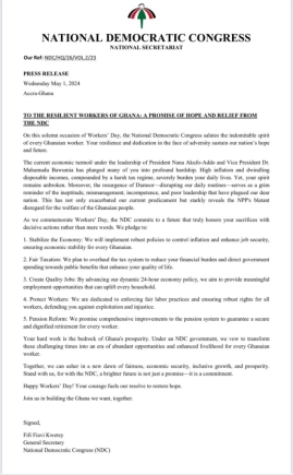 "As we commemorate Workers' Day, the NDC commits to a future that truly honours your sacrifices with decisive actions rather than mere words”, the statement said.