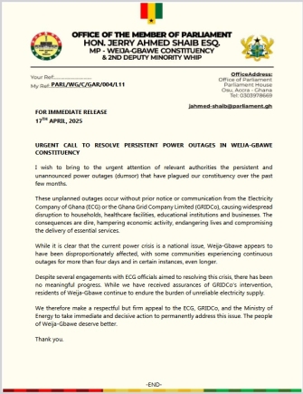 The Member of Parliament for Weija-Gbawe, Jerry Ahmed Shaib, has called for immediate intervention to address the persistent power outages that have severely affected lives and disrupted businesses in his constituency for several months.