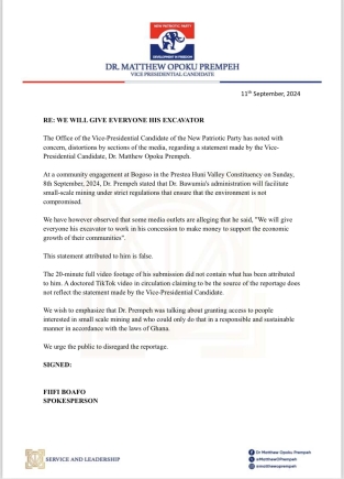 The Office of the Vice-Presidential Candidate of the New Patriotic Party has noted with concern, distortions by sections of the media, regarding a statement made by the Vice-Presidential Candidate, Dr. Matthew Opoku Prempeh.