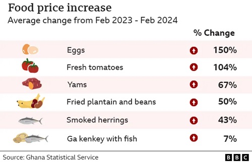 Eggs and tomatoes, for instance were more than twice as expensive in February 2024 as they were 12 months earlier. Other Ghanaian favourites have also shot up with wages not keeping pace.