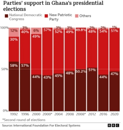 In that time, there have been three peaceful transfers of power, with the two main parties – the National Democratic Congress (NDC) and the New Patriotic Party (NPP) – holding the presidency for a total of 16 years each.