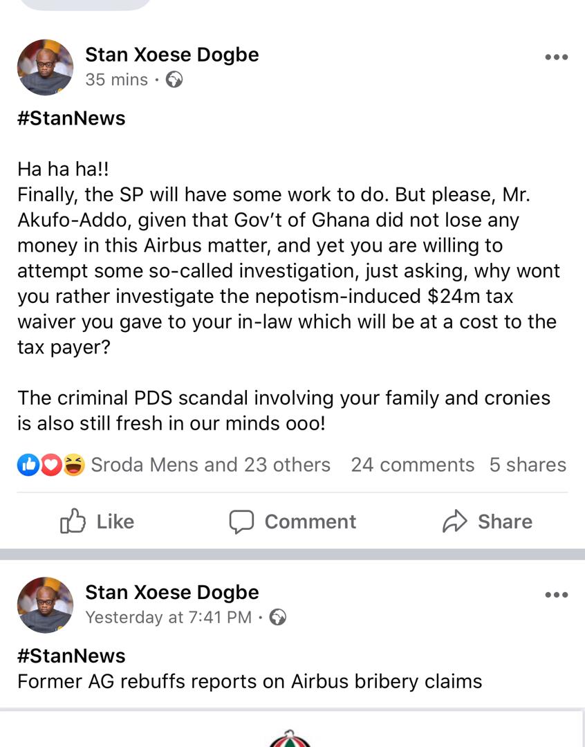 But in his Facebook post Monday morning [February 3, 2020], Mr Stan Dogbe wrote: "Ha ha ha!! Finally, the SP [Special Prosecutor] will have some work to do."