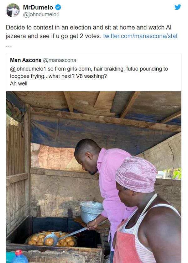 Responding to a query from a Twitter user about what gimmick was next on his campaign trail, Mr Dumelo posted: "Decide to contest in an election and sit at home and watch Al Jazeera and see if u go get 2 votes".