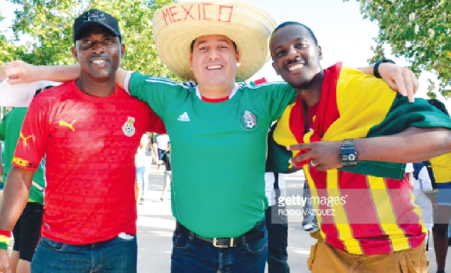Ghana and Mexico fans pose outside the NRG Stadium ahead of th