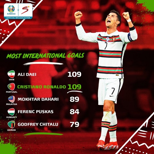 Ali Daei, who scored 109 goals for Iran between 1993 and 2006, and Ronaldo are the only two male players to score 90 or more international goals.