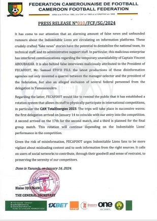 The Cameroon Football Federation (FECAFOOT) took a strong stance against a barrage of fake news swirling around the national team at the Africa Cup of Nations (AFCON) on Wednesday.