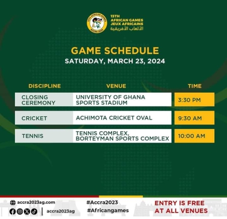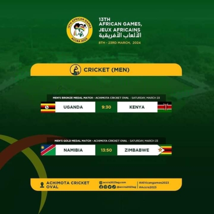 The cricket matches kick off with the bronze medal match between Uganda and Kenya at 9:30 am, while the men's gold medal match between Namibia and Zimbabwe is scheduled at the same Achimota Cricket Oval venue at 1:30 pm.