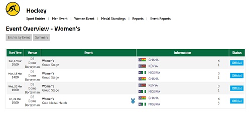 Field hockey made a controversial return to the African Games after an absence since 2003. South Africa, the previous dominant force in the sport at the Games winning all three previous editions in 1995, 1999 and 2003, opted out this year due to concerns about the pitch. With South Africa pulling out, the women's competition featured only three countries; Ghana, Nigeria and Kenya in the group stage.
